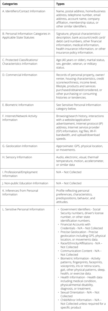 What Personal Information ADT Collects: ADT collects (and has collected in the previous 12 months) personal information from your use of our websites, products, services, and any devices with our products and services, including the following: