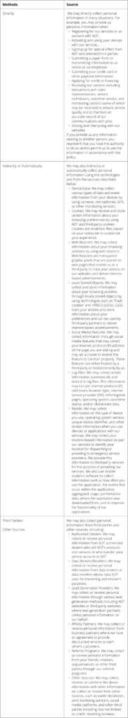 What Methods and Sources ADT Uses for Collecting Personal Information: ADT collects the personal information using several methods and from various sources, including the following: