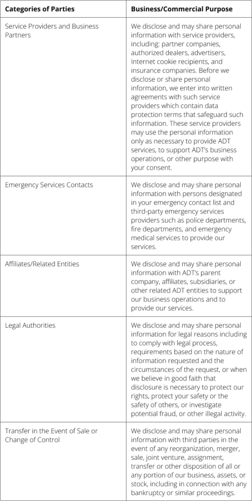 ADT discloses and may share personal information with various parties for various business purposes, including the following: